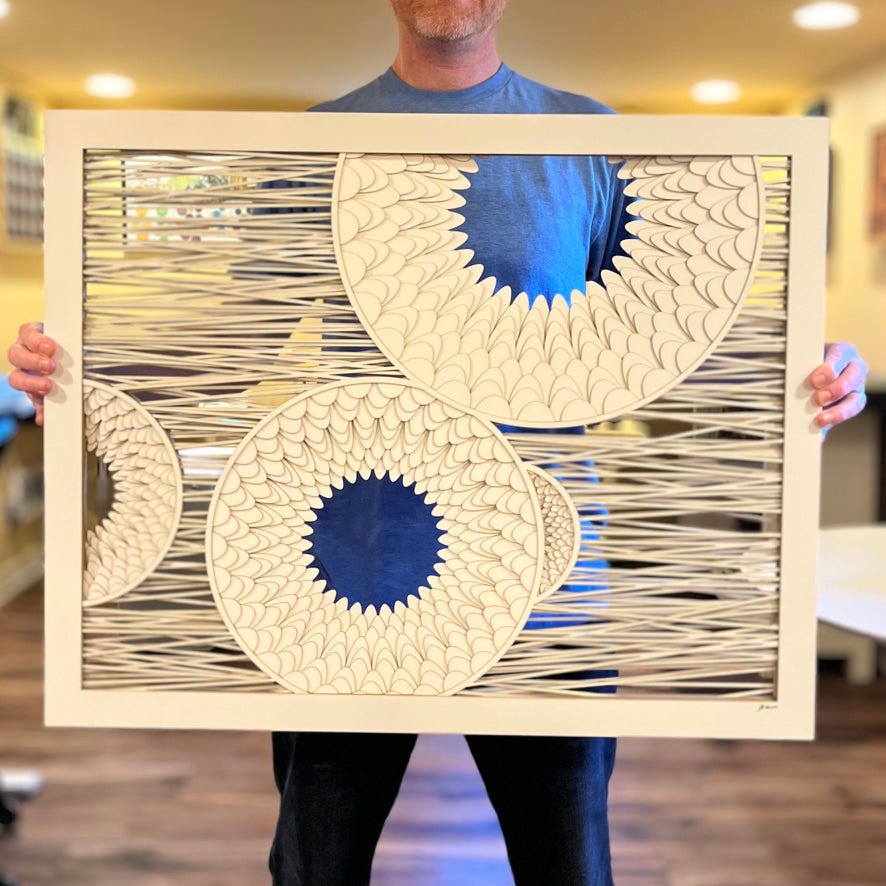 The work is generative, but not in the way most people understand that term. I write custom code for each piece. The algorithm generates a composition, layers, depth, color relationships. But then the digital becomes dimensional: laser-cut matboard that is hand-assembled into relief sculptures that exist in physical space.